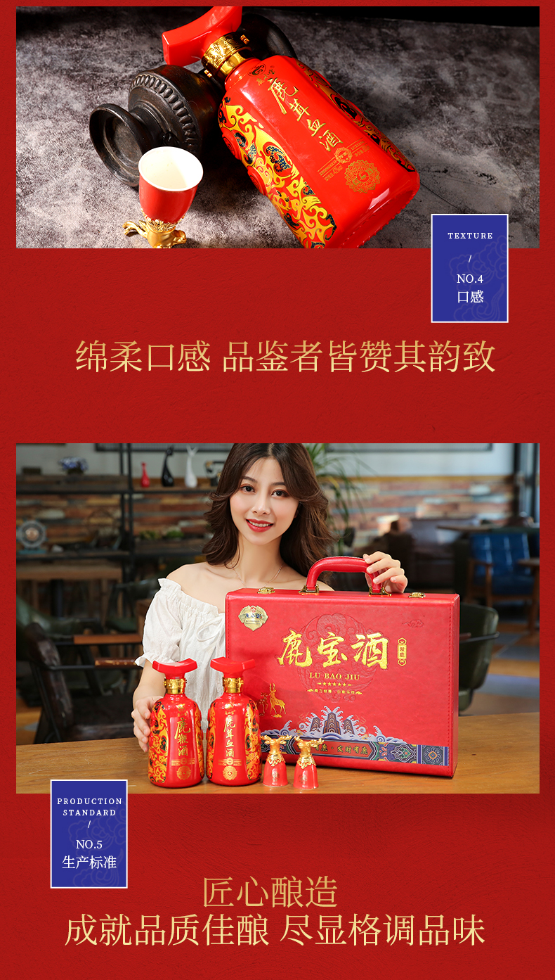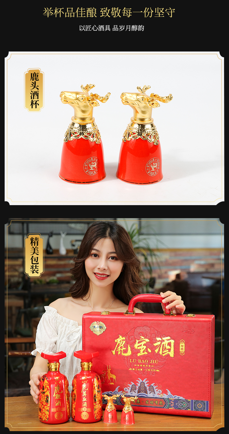 此产品为双瓶鹿宝酒,由鹿鞭酒x1,鹿茸血酒x1,包装选用中国红皮质材质,配置一对鹿头酒杯,整体视觉更加精美.